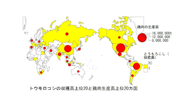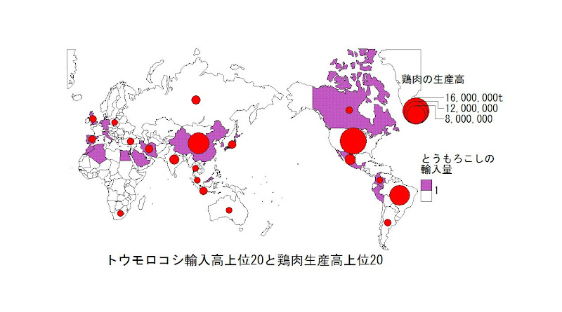 (3)重ね合わせ地図の作成(トウモロコシの生産・輸入と鶏肉の生産高の関係)