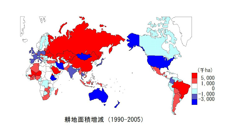 Excelファイルです。世界の耕地面積を年毎にまとめてあります。FAO(世界食糧機関)のデータをMANDARAに読み込めるように加工しました(疲れました)。引き算したり、割り算したりしていろんな地図を描いてみてください。